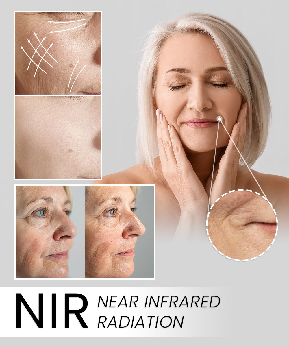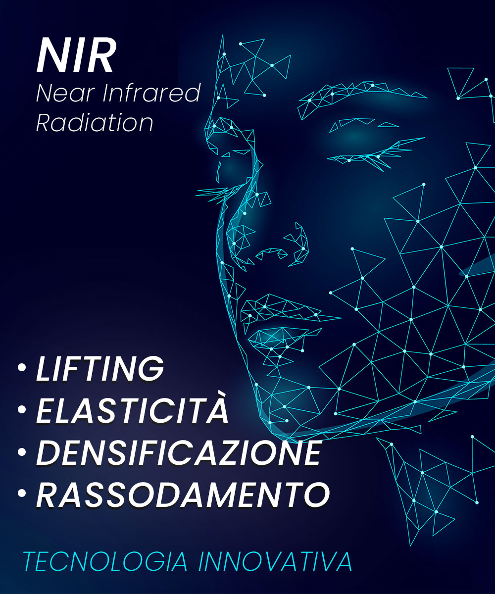 La tecnologia NIR (Near Infrared Radiation), ovvero la radiazione nel vicino infrarosso, utilizza la luce con una lunghezza d’onda compresa tra 900 e 1200 nanometri (nm). Questa parte specifica dello spettro luminoso è nota per penetrare in profondità nei vari strati della pelle, raggiungendo il derma senza danneggiare lo strato superficiale dell’epidermide. Il principio della tecnologia NIR si basa sulla capacità della luce del vicino infrarosso di convertire l’energia luminosa nel calore assorbito dai tessuti. Quando la luce NIR penetra nella pelle, la sua energia viene assorbita dalle cellule e convertita in calore. Questo riscaldamento locale del tessuto stimola i fibroblasti, cellule responsabili della produzione di collagene ed elastina, proteine fondamentali per mantenere l’elasticità, la compattezza e l’aspetto sano della pelle.Grazie a questo processo, la pelle viene “ravvivata” dall’interno , che porta alla reazione rigenerativa naturale del corpo. Stimolare la produzione di collagene ed elastina aiuta ad aumentare la densità e la compattezza della pelle, che a sua volta può ridurre la comparsa delle rughe e migliorare la struttura complessiva della pelle. Inoltre, il calore generato dalla luce NIR aiuta a migliorare la circolazione sanguigna nell’area trattata, favorendo ulteriormente il processo di rinnovamento della pelle e il suo aspetto sano.